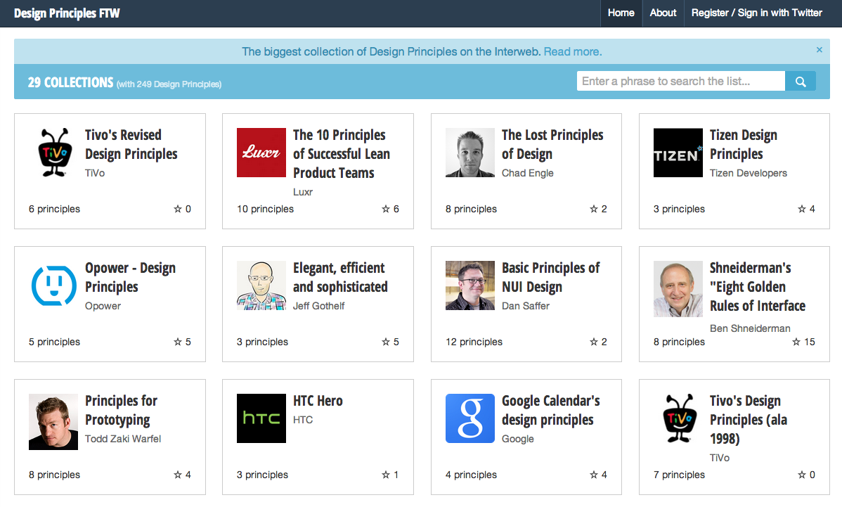 Design Principles FTW is a collection of the worlds most successful Design Principles. Read them, use them and let them inspire you to create your own sets of principles.
