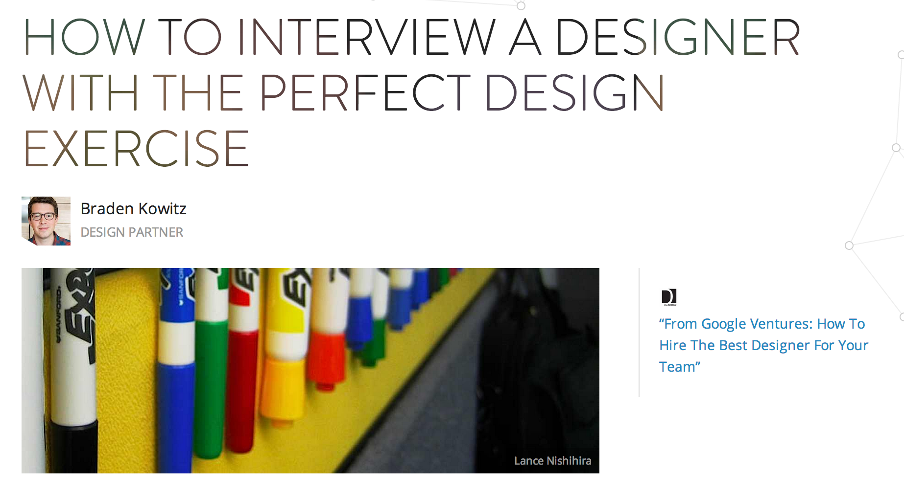 I wasn’t really good at interviewing designers until I had a few dozen interviews to compare. So if this is your first time interviewing a designer, I highly recommend finding a design advisor to help interview (and source) candidates for your startup. I’ll often do this for startups as part of my role at Google Ventures, and we’ve found it useful in nearly every case. For teams without designers, a design advisor is just about the only way to get an accurate read on a candidate’s design skills. And for teams with designers, it’s nice to have a second opinion from someone who’s done a bunch of interviews recently.
